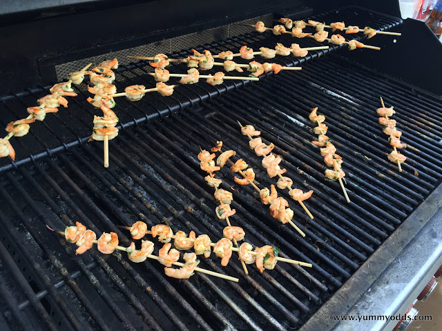 - Next day morning, take it out right before grilling, insert each shrimp on to skewers and grill these for 5 min on each side. If shrimp are drying out, brush with olive oil when they are on grill.